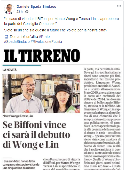 Un post tacciato di razzismo e che sui social sta tenendo banco in queste ore di campagna elettorale diventata infuocata: è quello lanciato su Facebook dalla pagina ufficiale del candidato di centrodestra Daniele Spada. Spada ha ripreso il titolo di un articolo del quotidiano Il Tirreno, che metteva in evidenza come, in base alle preferenze ottenute al primo turno e in caso di vittoria di Biffoni, i candidati di origine cinese Marco Wong e Teresa Lin “avrebbero fatto il loro debutto” in consiglio. Su questa base Spada ha posto una domanda, rivolgendosi ai suoi follower: “Siete sicuri che sia questo il futuro che volete per la nostra città?”.