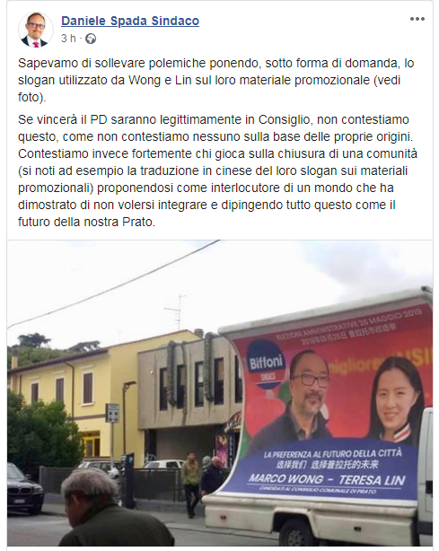 Il candidato del centrodestra non ritratta, ma a posteriori spiega che la domanda intendeva ricalcare provocatoriamente il materiale elettorale di Wong e Lin con lo slogan che recitava “La preferenza al futuro della città”. “Non abbiamo messo la foto del cartellone elettorale di Wong e Lin nel primo post, l’abbiamo messa nel secondo post – spiega Spada -. Comunque figuriamoci se siamo contro i cittadini di altre nazionalità: il candidato più votato della Lega è un ragazzo in gamba e bravo come Claudiu Stanasel. Certo, noi contestiamo il fatto che ci si rivolga in quei manifesti ad una parte di comunità che dimostra di non volersi integrare”.