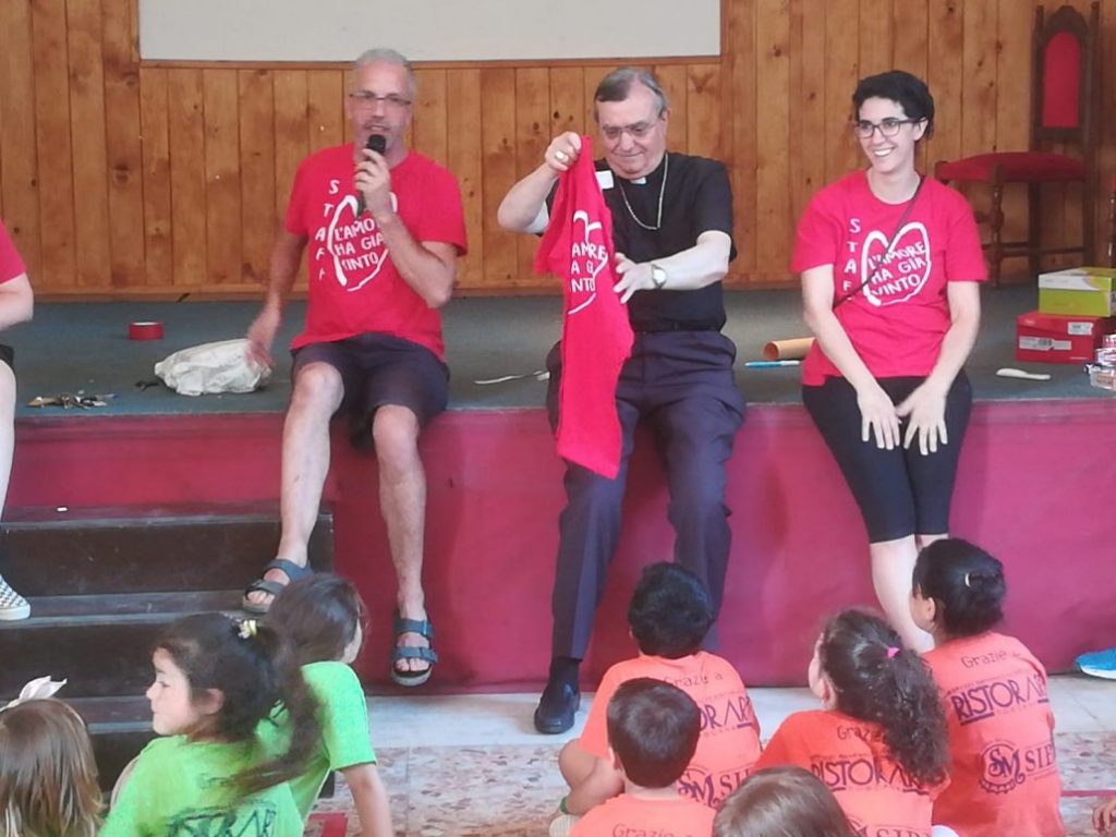 Poi come detto, monsignor Agostinelli ha incontrato i quasi duecento partecipanti all’esperienza dell’oratorio estivo a Sant’Anna. Il Vescovo ha dialogato con i bambini e i ragazzi presenti, che per l’occasione avevano preparato per lui dei disegni di benvenuto e di saluto. Per il Presule infatti questa sarà l’ultima estate alla guida della diocesi di Prato. Poi monsignor Agostinelli, come ogni giorno fanno tutti i bambini, ha preso il vassoio e si è messo in fila per ricevere il pranzo e poi lo ha consumato insieme a loro. I responsabili di Sant’Anna, Corrado Caiano e Sara Baldi hanno consegnato al Vescovo la maglietta dello staff dell’oratorio. La mattinata di festa si è conclusa con una bella torta di frutta con su scritto: «Grazie di cuore Vescovo Franco».