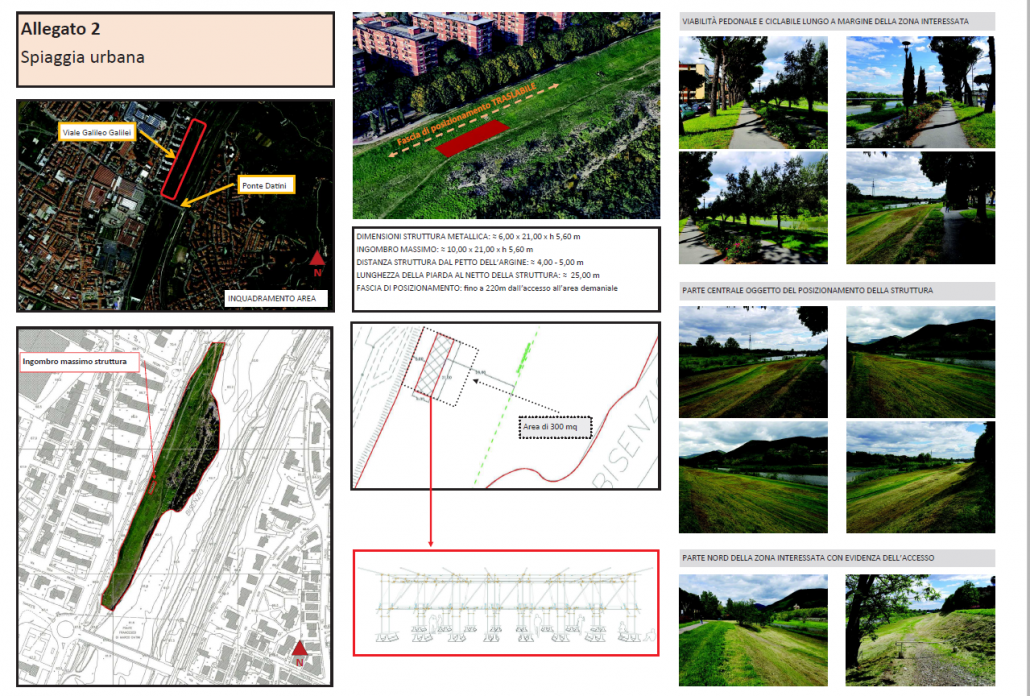 Qualità della proposta ma anche attenzione alla sostenibilità e all’economia circolare: questi i principali elementi che saranno valutati dall’Amministrazione. Amministrazione che nell’area della spiaggia urbana installerà a proprie spese il progetto Shelter numero 1, firmato dagli architetti dello studio pratese Ecòl e vincitore del premio Architettura Toscana per la sezione “rigenerazione urbana”. Dopo l’esperienza positiva al Macrolotto Zero della scorsa estate, la struttura (composta da 769 metri lineari di tubi e giunti, da coperture in pvc e da jersey usati come basi e sedute) verrà ricollocata sull’argine per accogliere attività varie: un luogo di aggregazione, finanziato in precedenza con fondi regionali sulla sicurezza urbana, che nelle intenzioni della Giunta sarà spostato in città a seconda delle esigenze.