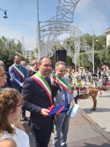 Anche quest’anno il Comune di Montemurlo non è voluto mancare a Bovino alle celebrazioni della Madonna di Valleverde e alla Cavalcata storica, la festa patronale della cittadina pugliese, da dodici anni gemellata con Montemurlo. Per la prima volta Simone Calamai, dopo la sua elezione a maggio scorso, ha partecipato alla festa di Bovino in veste di sindaco. Sono moltissimi i cittadini di Montemurlo, sopratutto quelli residenti a Oste, che provengono dalla cittadina pugliese e che d’estate approfittano della grande festa patronale per ritornare nel proprio paese d’origine.