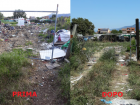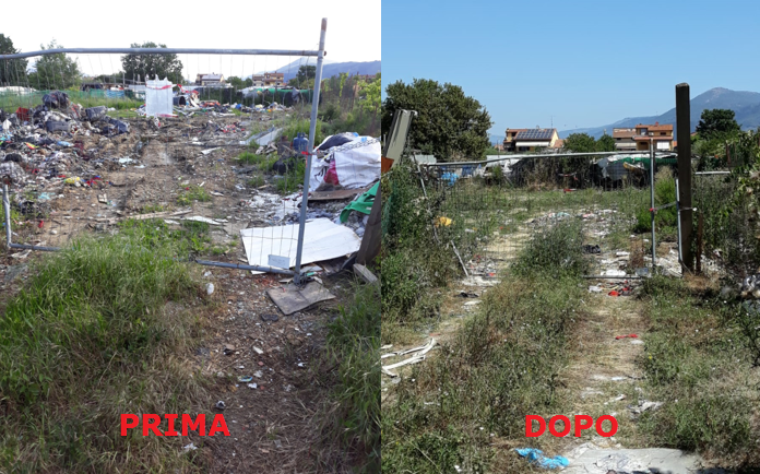 In tutto sono state recuperate 80 tonnellate e mezzo di rifiuti, composti prevalentemente da colli di scarti tessili, e da altri rifiuti speciali quali pneumatici, rottami ferrosi, bombole di gas, ma anche rifiuti pericolosi quali l’amianto. La bonifica è avvenuta sotto stretta sorveglianza degli ufficiali ed agenti della polizia municipale che, previa rimozione dei sigilli, hanno scortato i mezzi per le operazioni di ripulitura, riapponendo i sigilli a conclusione di ogni intervento. Il sequestro e il monitoraggio delle operazioni ha quantomeno impedito l’ulteriore abbandono e accumulo di rifiuti e ha restituito pulizia ad una piccola porzione dell’area come si vede nella foto sotto, scattate prima e dopo l’intervento.