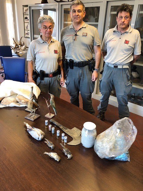 Le indagini e i successivi controlli hanno permesso di ritrovare, oltre al cibo e alle attrezzature utilizzate per il foraggiamento vietato, quattro uccelli la cui caccia non è consentita dalla legge, conservati all’interno di un congelatore (una tortora dal collare, un passero d’Italia, una passera mattugia e una capinera), tre esemplari di fauna selvatica imbalsamata appartenenti a specie vietate (un gruccione, un totano morto e un airone rosso), sei munizioni a palla non denunciate e 1,5 kg di polvere da sparo, anche questa non denunciata.