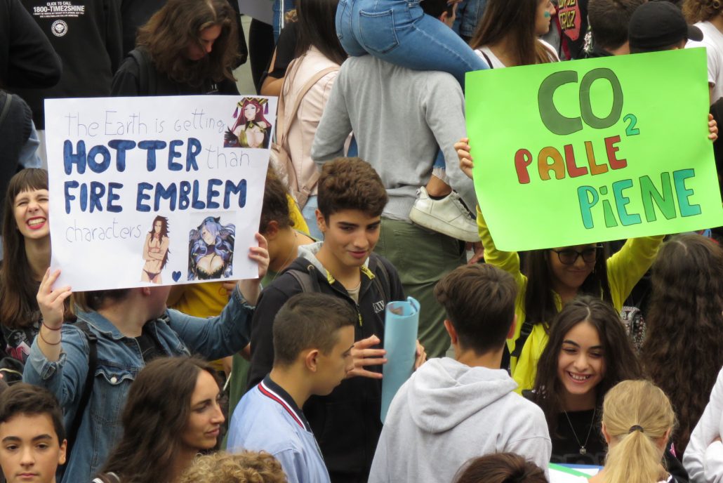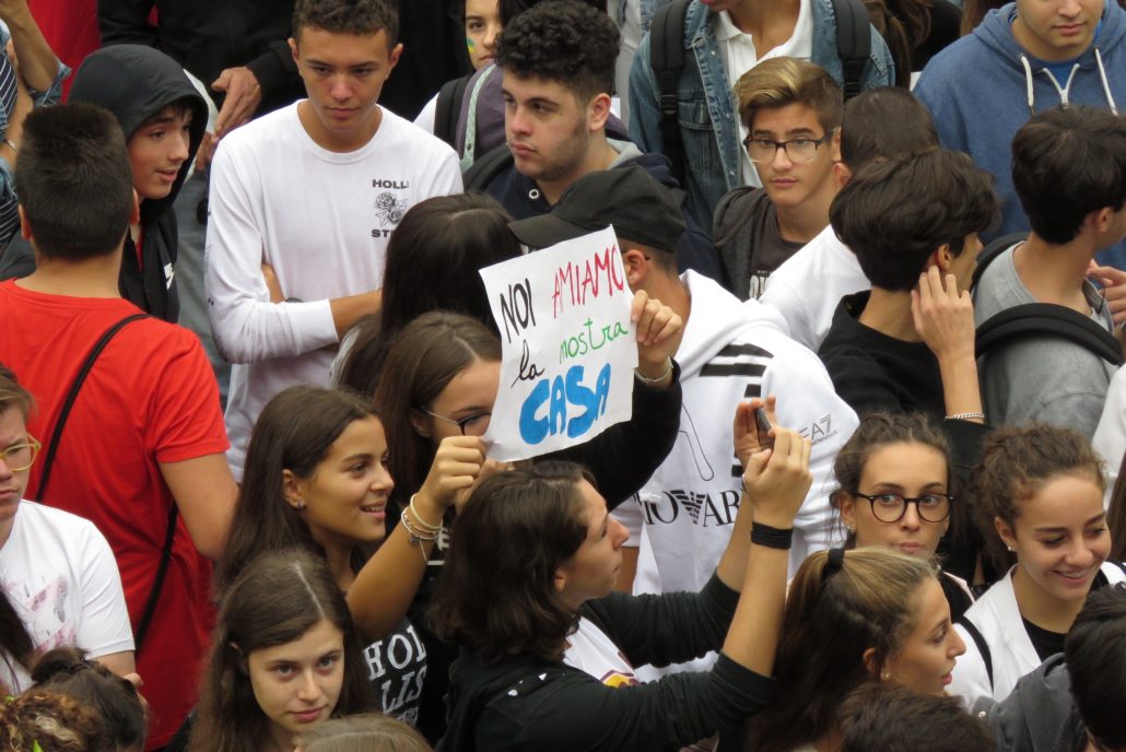 Il lungo e colorato corteo – animato dal suono della banda della scuola media Mazzoni – ha invaso il centro storico fino alle 12. Tra le tappe obbligatorie anche piazza Duomo, dove la pacifica protesta è andata avanti a suon di canti e con tanto di cartelloni, tra slogan e giochi di parole davvero originali.