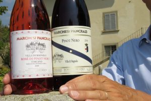 Una produzione di eccellenza, un nettare nero ormai apprezzassimo anche all’estero. E’ il Pinot nero della Tenuta dei Marchesi Pancrazi a Bagnolo: si è appena conclusa la vendemmia 2019. Una vendemmia di qualità, che, come numeri, si attesta sulle 10-12mila bottiglie. La tenuta dei marchesi Pancrazi comprende cinque ettari di terreno coltivati a Pinot Nero, una produzione che in Toscana, terra del sangiovese, in pochi fanno. Qui il vitigno ha attecchito particolarmente bene, complici le caratteristiche del terreno ai piedi del Monteferrato, l’umidità superficiale e le brezze serali del vicino Appennino. Dopo la morte del marchese Vittorio Pancrazi, avvenuta nel gennaio 2018, è il nipote Giuseppe ad occuparsi di produzione e vendita, portando avanti la tradizione di famiglia.