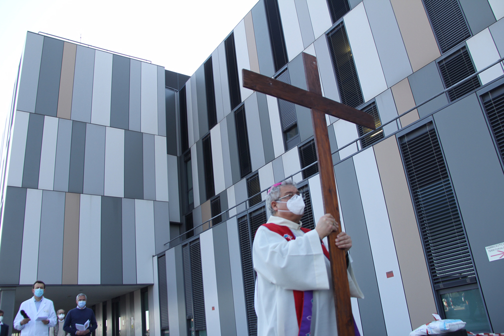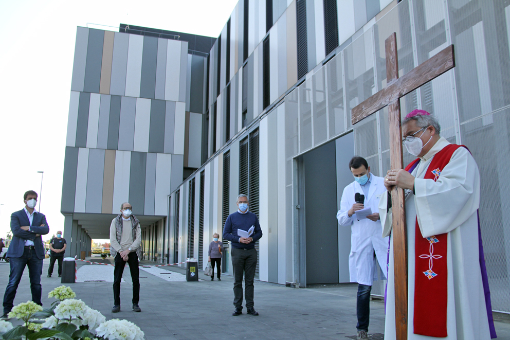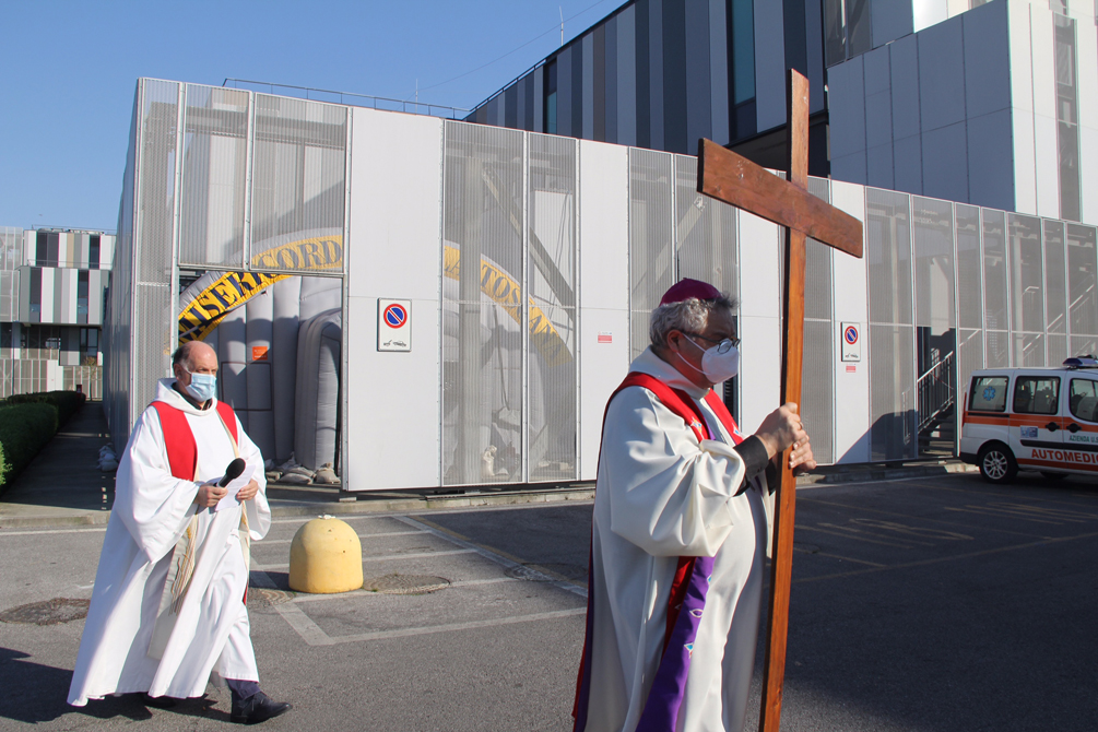 Il dolore di Cristo sulla croce e il dolore dell’uomo nel letto di un ospedale. Il vescovo Giovanni Nerbini ha scelto di celebrare la via crucis intorno al Santo Stefano come segno di speranza e di vicinanza ai malati e al personale sanitario quotidianamente impegnato nell’assistenza. Con la mascherina in volto, insieme al cappellano ospedaliero don Carlo Bergamaschi, il Vescovo ha portato la croce lungo il perimetro del complesso dell’ospedale fermandosi davanti alla tenda pre-triage, all’ingresso dei pazienti Covid e al pronto soccorso. Punti «caldi» di questa difficile emergenza sanitaria che stiamo vivendo. Sono state queste alcune delle stazioni della via crucis celebrata in questo inedito venerdì santo al tempo del coronavirus.