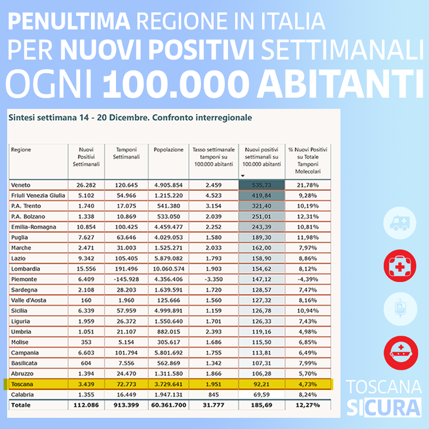 I nuovi casi positivi registrati nelle ultime 24 ore in Toscana sono 452 su 6.638 tamponi molecolari e 765 test rapidi effettuati. Lo ha anticipato, su Facebook, il presidente della Regione Eugenio Giani, che ha diffuso anche un dato confortante, riferito all’andamento del contagio la settimana scorsa (da lunedi 14 a domenica 20 dicembre): “La Toscana è penultima tra le regioni nel rapporto dei nuovi casi positivi su 100.000 abitanti, un dato importante che non deve farci abbassare l’attenzione” ha scritto Giani nel suo post.
