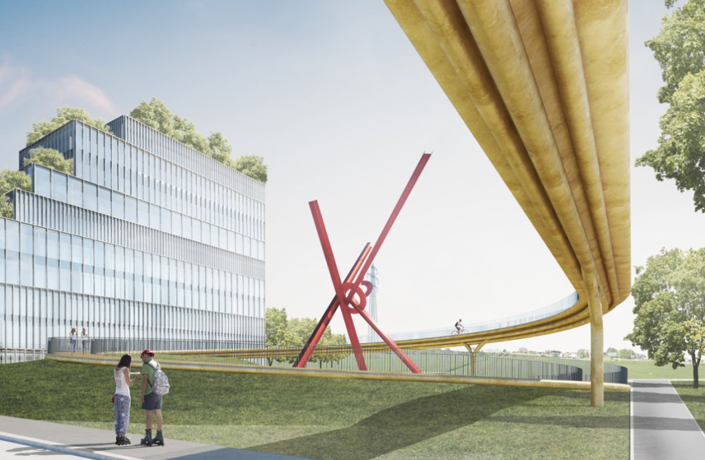 Il collegamento della ciclovia con la città è costituito dal ponte pedonale di prossima realizzazione progettato dall’architetto Maurice Nio, lo stesso che ha curato l’ampliamento del Centro Pecci.