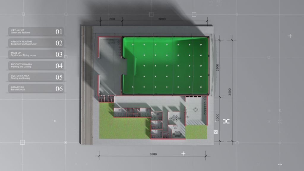 Il teatro di posa indicato nel progetto si sviluppa complessivamente su un’area di 1300 metri quadrati, al cui interno trovano spazio uno studio virtual set di 600 metri quadrati e 9 metri di altezza, e aree ulteriori per il real time, per il trucco, per la produzione, per il reparto costumi e per il relax.