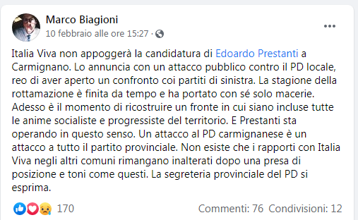 L’attacco di Longo non è andato giù al consigliere pratese Marco Biagioni, che invita il PD a prendere posizione: “Un attacco al PD carmignanese è un attacco a tutto il partito provinciale – scrive Biagioni su Facebook – Non esiste che i rapporti con Italia Viva rimangano inalterati dopo una presa di posizione e toni come questi”.