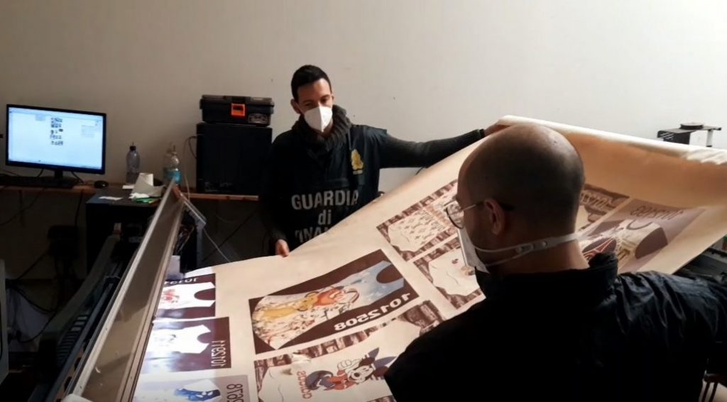 All’interno sono stati sequestrati oltre 317.200 loghi per maglie e 17.000 loghi per mascherine, già stampati su carta transfer e pronti per essere impressi sul tessuto.
