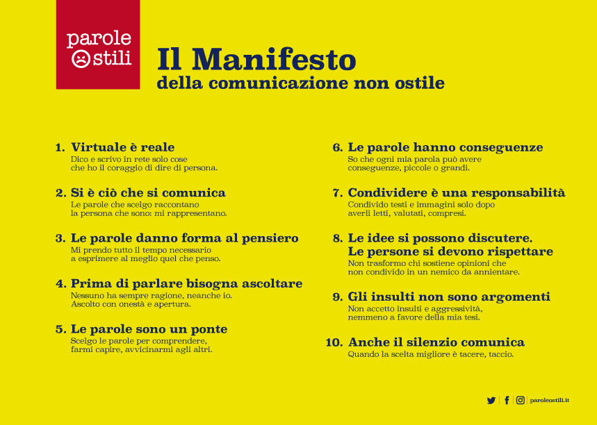 Adesso il “Manifesto della Comunicazione non ostile” sarà diffuso nelle scuole, negli ambienti sportivi, culturali e aggregativi, ma la volontà è di farlo conoscere anche nei luoghi di lavoro. «Siamo certi che in questo modo Prato possa essere più bella, accogliente, sicura e solidale, attraverso la promozione di relazioni senza odio e intolleranza, centrate sull’ascolto, il dibattito civile ed il rispetto reciproco».