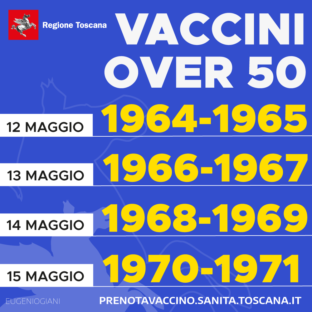 Il cronoprogramma dell’apertura delle agende, per completare l’intera fascia anagrafica degli over 50, prevede la calendarizzazione che si riporta di seguito. I dettagli sull’orario di apertura delle agende saranno comunicati giornalmente tramite apposita comunicazione istituzionale. I nati negli anni 1966 e 1967 (i 55 e 54enni) potranno prenotare sul portale regionale giovedì 13 maggio. I nati negli anni 1968 e 1969 (i 53 e 52enni) potranno prenotare, invece, venerdì 14 maggio. Infine, per i nati negli anni 1970 e 1971 (ovvero per i 51 e 50enni) le agende saranno aperte sabato 15 maggio.