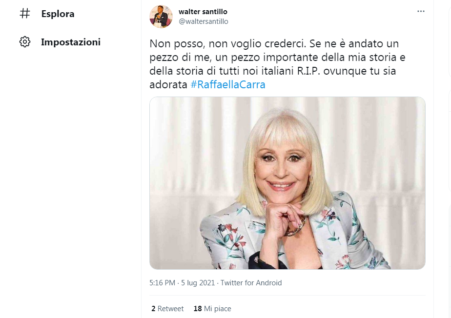 Sulla sua pagina twitter, Santillo ha scritto: “Non posso, non voglio crederci. Se ne è andato un pezzo di me, un pezzo importante della mia storia e della storia di tutti noi italiani. Rip ovunque tu sia adorata #RaffaellaCarrà”.