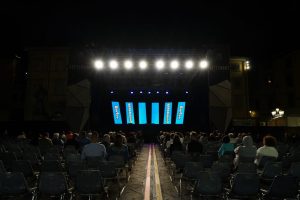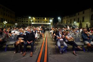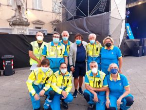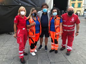 Prima dello spettacolo Brignano ha avuto modo anche di scattare qualche foto con i volontari della Misericordia e della Croce rossa, in piazza per facilitare le operazioni di accesso e di controllo dei green pass degli spettatori.