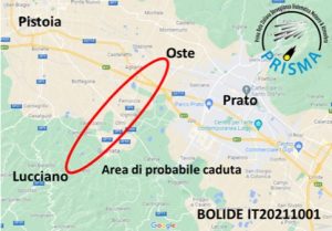 Una roccia di pochi centimetri di diametro, dal peso fra i 30 e i 100 grammi, di colore nero intenso. È tutto quello che potrebbe essere arrivato al suolo del bolide particolarmente luminoso che la notte del 1° ottobre, intorno alle 3 del mattino, ha attraversato il cielo, avvistato da ben otto telecamere della rete Prisma situate in Toscana e nel centro Italia (San Marcello Pistoiese, Navacchio, Scandiano, Cecima, Camerino, Chianti, Piombino, Perugia).