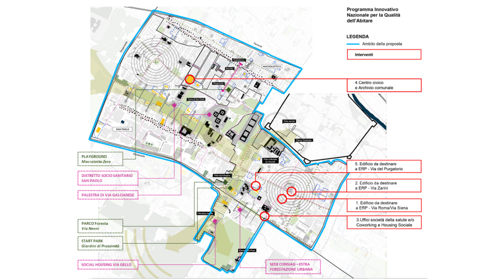 Nel dettaglio sono due le tipologie di interventi del PINQUA: riqualificazione di edifici esistenti da dedicare ad edilizia residenziale pubblica, in cui coniugare il miglioramento della qualità architettonica e delle prestazioni energetiche; rivitalizzazione degli spazi pubblici creando un nuovo sistema di attrattori urbani capaci di mettere in relazione i vari ambiti tra loro e con il contesto cittadino, in cui accogliere funzioni diversificate, come co-working, centro civico, sedi di associazioni, necessarie allo sviluppo delle strategie di riqualificazione urbana ipotizzate. Ecco i numeri del progetto: 17 nuovi alloggi residenziali pubblici, 8 nuovi alloggi residenziali convenzionati, 5500 mq di nuovi spazi a servizio di associazioni e terzo settore, e nuovi servizi pubblici, 650 mq di nuovi spazi commerciali e di ristorazione.