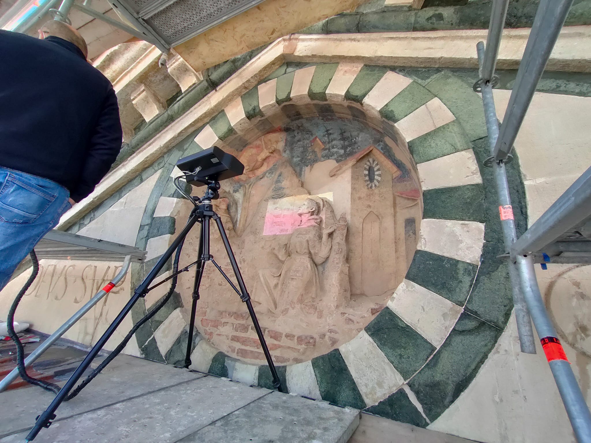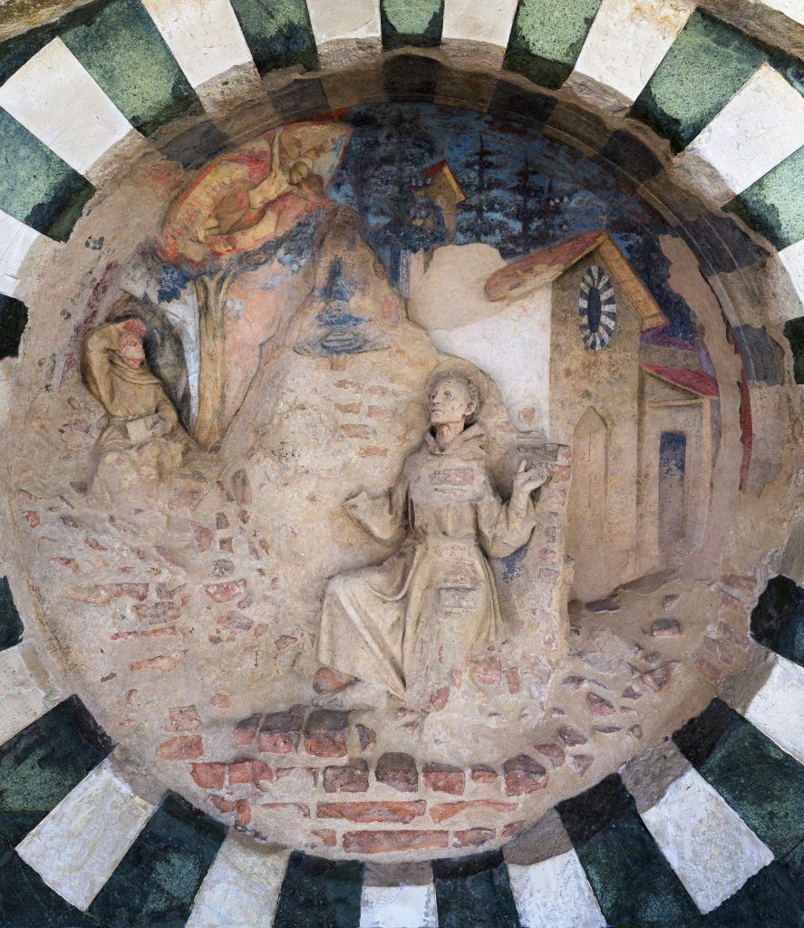 Adesso, grazie ai lavori di restauro sono state compiute delle nuove analisi e il rilievo in stucco è stato osservato da vicino, come forse non era mai stato fatto prima. «Nonostante sia da circa sei secoli sotto gli occhi di tutti, questo rilievo rappresenta una delle opere meno conosciute dell’intero patrimonio artistico della città», scrive Brunori. Così, guardando i dettagli, specialmente gli elementi prospettici e la particolare tecnica realizzativa, la funzionaria delle Belle Arti propone questa nuovissima attribuzione. Come detto l’intervento ha dato modo di apprezzare l’accuratissima e spettacolare elaborazione dell’altorilievo nel quale è stato rappresentato il momento in cui San Francesco, ritirato sul monte della Verna in appartata meditazione, riceve la visione del serafino mistico che in forma di Cristo Crocifisso gli donò le stimmate. Alle spalle del Santo c’è uno spuntone roccioso, si vedono degli alberi di conifere. Ai piedi di un albero, come inglobato nella roccia, si trova Frate Leone, sulla destra è raffigurata una chiesa, identificata con il convento della Verna.
