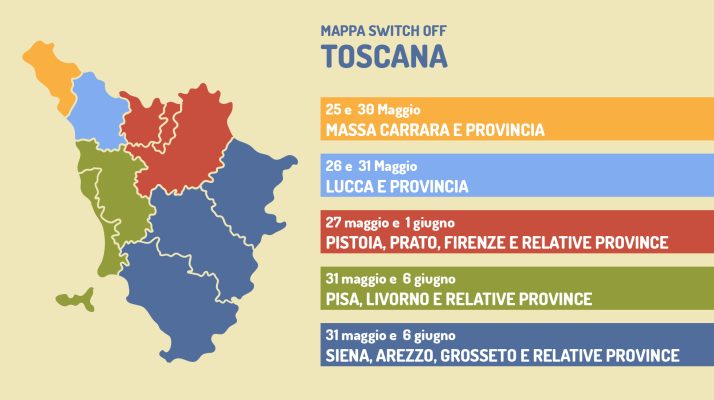 Negli altri comuni della provincia di Prato lo switch-off avverrà mercoledì 1 giugno. Da quella data anche a Prato, Montemurlo, Carmignano e Poggio a Caiano la nostra emittente sarà visibile sul canale 75 e non piu sul 74.