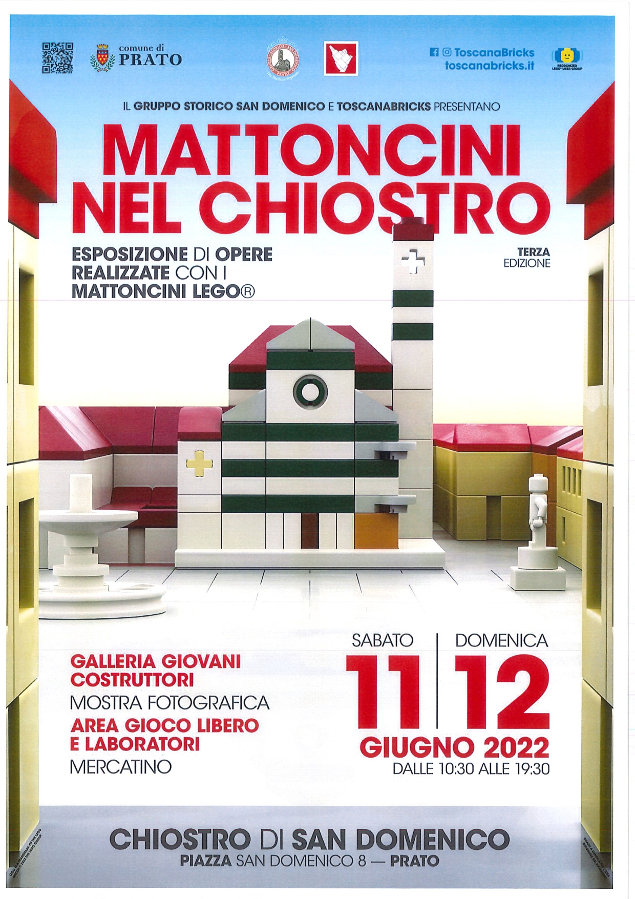 Questo fine settimana sarà dedicato alla terza edizione dell’evento «Mattoncini nel chiostro», promosso dal Gruppo storico San Domenico insieme a ToscanaBricks: un’esposizione di opere realizzate con i famosi mattoncini Lego, allestita questi sabato 11 e domenica 12 giugno, nel chiostro di San Domenico e aperta dalle 10.30 alle 19.30. Oltre all’esposizione, ci saranno: la Galleria Giovani Costruttori, una mostra fotografica, un’area gioco libero con laboratori ed un mercatino.