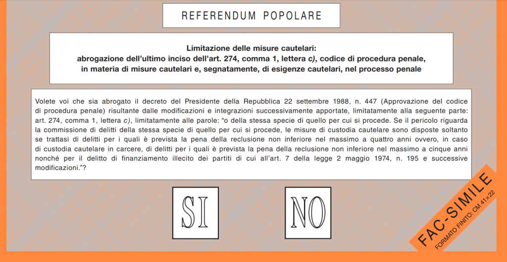 Il 12 giugno i cittadini sono chiamati alle urne per il referendum sulla giustizia, un pacchetto di cinque quesiti che vanno dalla legge Severino alle misure cautelari, e ancora, funzioni dei magistrati, candidature al Csm e consigli giudiziari. Per quanto riguarda il secondo quesito, si chiede ai cittadini di abrogare la “reiterazione del reato” dai motivi per i quali i giudici possono disporre la custodia cautelare in carcere o i domiciliari per una persona durante le indagini, e quindi prima del processo.