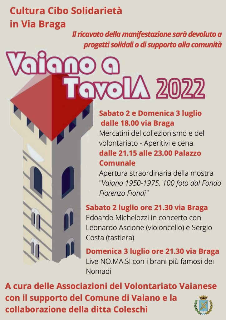 Finalmente sabato 2 e domenica 3 luglio torna “Vaiano a Tavola”, la manifestazione che mette insieme cultura, cibo e solidarietà con il supporto del Comune di Vaiano. L’evento è stato presentato a palazzo comunale dagli assessori alle Politiche Sociali Giulio Bellini e al Turismo Beatrice Boni, insieme ai Carla Sacchetti della Caritas Vaiano, Eleonora Vannucchi di “Aiuti dalla Vallata” e Claudio Vaiani della Pubblica Assistenza.