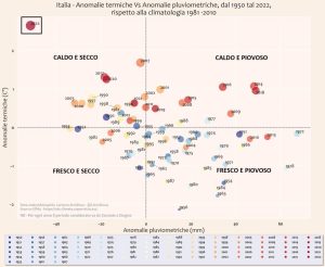 Lo studio prende in esame l’andamento del clima in Italia dal 1950 al 2022 nel semestre gennaio-giugno, classificando ogni anno secondo i due parametri dell’anomalia di precipitazione e temperatura rispetto al periodo 1981-2010 classificando la serie in quattro tipologie: caldo e secco, caldo e piovoso, fresco e secco e fresco e piovoso. Il 2022 si posiziona come anno caldo e secco ma nettamente fuori scala rispetto a tutti gli altri 72 anni. Gli anni più caldi, tra gennaio e giugno, sono quasi tutti posteriori al 1997, quelli più freddi invece cadono per la maggior parte nel periodo precedente. Gli anni 2000 si contraddistinguono per una grande variabilità pluviometrica, cioè si osservano semestri con grande disponibilità idrica alternati a semestri molto secchi. Elemento costante, invece, sono le temperature quasi sempre superiori alla norma.