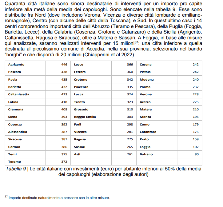 Nella tabella (numero 9 a pagina 27 dello studio) che elenca le quaranta città italiane sinora destinatarie di interventi per un importo pro-capite inferiore alla metà della media dei capoluoghi si evince che Prato, con un impatto di 159€ per cittadino, è davanti solamente a Foggia (102€) e Bolzano (80€). “Allarmante pensare che la prima di queste quaranta città, che sono comunque al di sotto della media dei capoluoghi, è Agrigento con 446€ pro capite e che solamente in sei città si scende al di sotto dei 200€ a cittadino”, affermano Prato in Azione e +Europa.