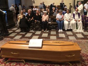 Sulla bara sono collocate la mitra e la Bibbia. Nelle prime file sono seduti i familiari di Simoni con le sorelle Gabriella e Maria.