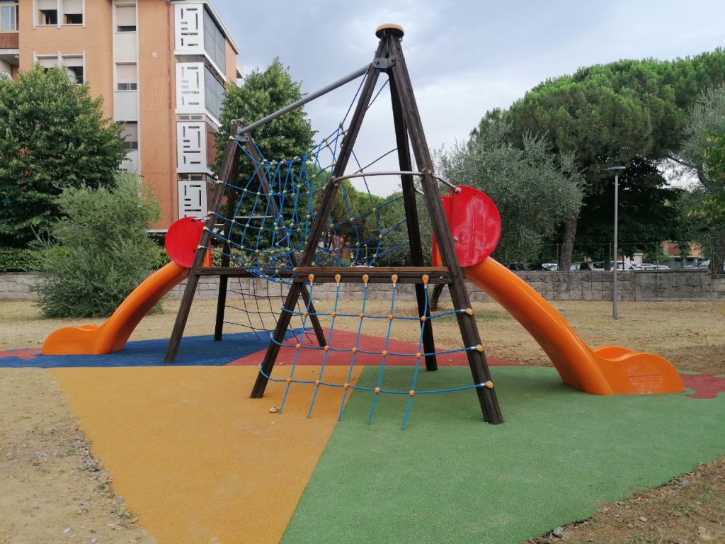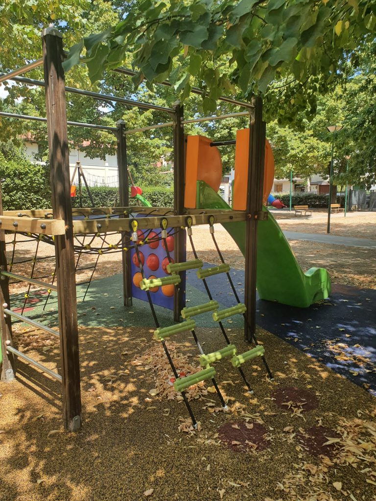 L’ultimo intervento di riqualificazione ha riguardato la sistemazione di alcuni giochi, come la struttura a 2 torri della marca “Holzhof”, composta da arrampicate in corda e tunnel scivolo, a cui sono state ristrutturate le parti in legno e sostituite le corde, ma ha interessato anche la pavimentazione sottostante le attrezzature ludiche. Prima dell’avvio dei lavori, infatti, erano presenti vecchie mattonelle di gomma antitrauma in avanzato stato di usura che hanno richiesto una sostituzione completa con una nuova pavimentazione in gomma colata.