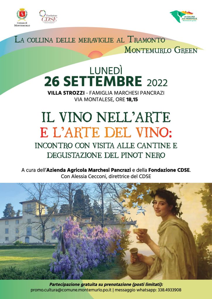 “Il vino nell’arte e l’arte del vino”, una visita guidata alle cantine del Marchese Pancrazi di Villa Strozzi a Bagnolo, a cui seguirà una degustazione dei vini prodotti dall’azienda agricola montemurlese, famosa nel mondo per il Pinot Nero, prodotto alle pendici del Monteferrato. L’appuntamento è per lunedì 26 settembre ore 18,15.