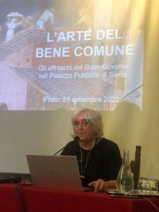 Carlotti si è soffermata sull’articolato e affascinante affresco di Ambrogio Lorenzetti che doveva far da modello al governo dei Nove, nella Siena dei primi decenni del Trecento. “L’affresco del Buon Governo è in realtà l’immagine del Bene comune – ha evidenziato Carlotti – penso che mai come in questo momento le mosse della politica nazionale e internazionale devono essere dettate dal bene comune che forse è il patrimonio più importante che abbiamo dimenticato. Lorenzetti ce lo ricorda mettendo davanti agli occhi dei governanti dei cittadini di Siena gli effetti tanto diversi che nascono dal perseguire il bene comune e il bene proprio”.
