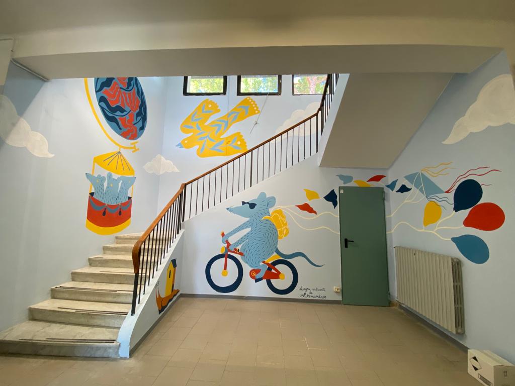 A rifinitura degli interventi strutturali realizzati, che come tali non vengono rilevati perché sono solitamente coperti da intonaco e arredi, alla scuola Da Vinci di Vergaio sono stati realizzati alcuni disegni sulle superfici per abbellirle e evidenziare i punti dove sono stati fatti gli interventi.