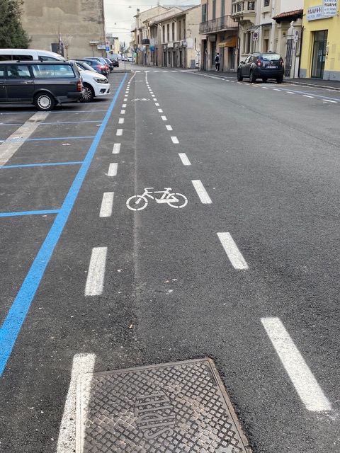 Attraverso l’intervento si vuole costituire una continuità della rete ciclabile tra via Strozzi e via Pistoiese, con la realizzazione di una zona 30 e una bike lane (corsia per biciclette disegnata a terra lungo la sede stradale, nella foto sotto) con ampiezza di 1 metro.