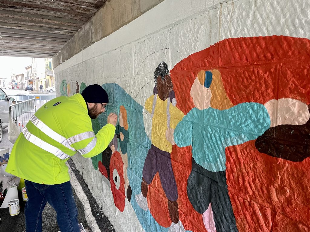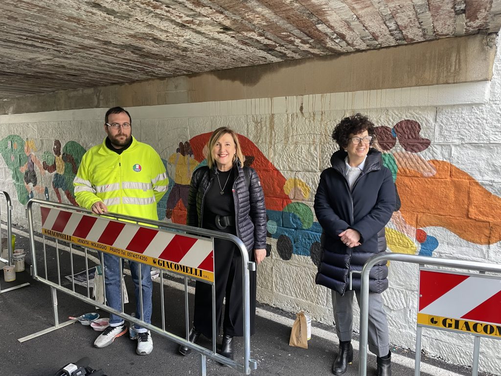 A rendere più bello il percorso anche un murales realizzato da Guido Bati (nella foto sopra) per la riqualificazione del sottopasso di via Marini. “Gioia e tranquillità” – questo il titolo dell’opera – ritrae piccole scene di vita quotidiana: ragazzi che corrono, bambini che giocano con gli anziani al parco. Così Guido Bati, pittore pratese, ha immaginato i suoi murales, realizzati per contribuire alla riqualificazione che il Comune sta attuando in alcune zone della città. L’artista sta realizzando i disegni su entrambi le pareti del cavalcavia con tempere acriliche indicate per gli spazi esterni.