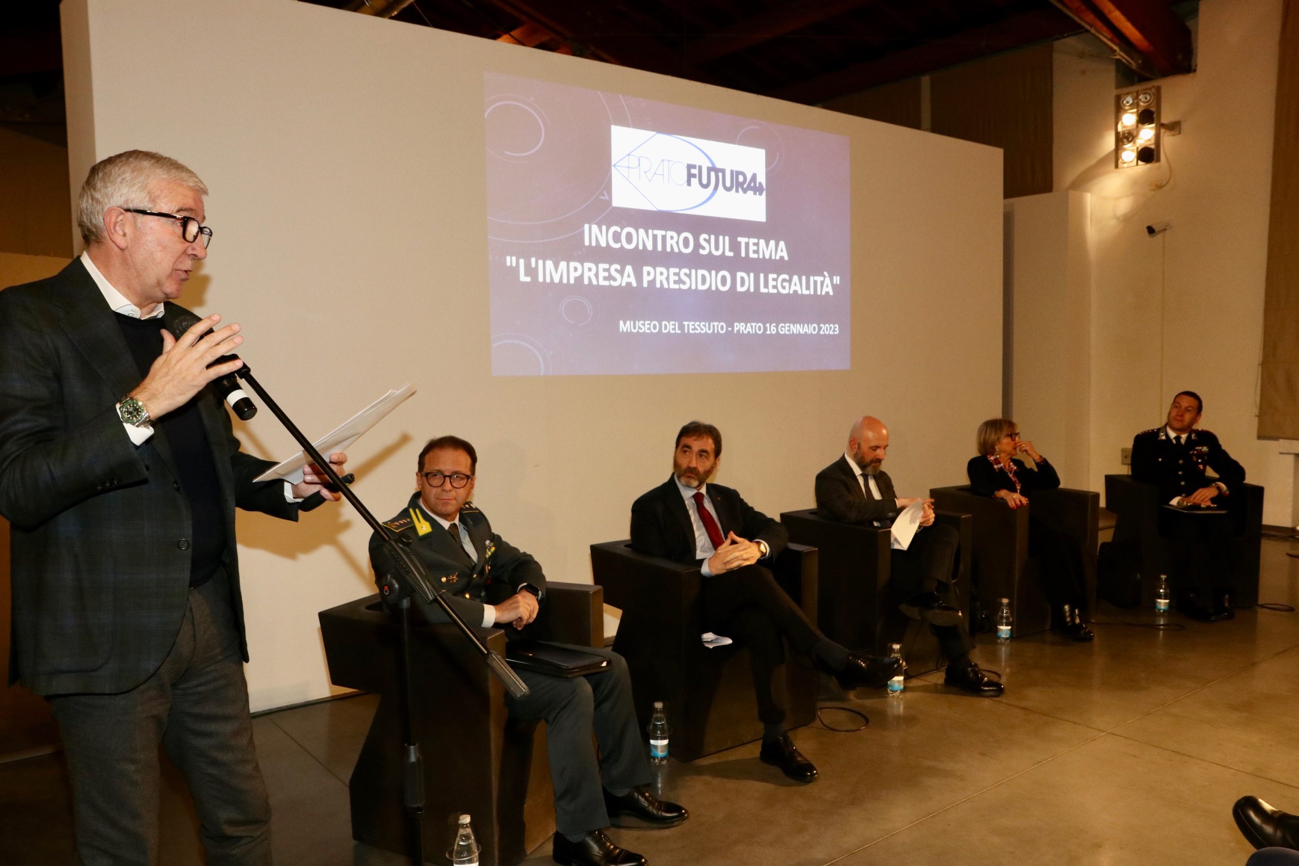 Tanti gli interventi e le riflessioni a tutto campo, illustrate alla platea da parte dei vari partecipanti alla discussione: il prefetto di Prato Adriana Cogode e il comandante provinciale della Guardia di Finanza Enrico Blandini, come detto, insieme al comandante provinciale dell’Arma dei Carabinieri Francesco Zamponi e al questore Giuseppe Cannizzaro. Da parte di tutti è stata ribadita la massima disponibilità a collaborare con gli imprenditori e ad alimentare un dialogo proficuo per affrontare le criticità che affliggono il sistema produttivo pratese: dalla concorrenza sleale al lavoro nero, dal sommerso alla pirateria, fino alla contraffazione. Nel corso dell’evento sono intervenuti per un saluto anche il vescovo di Prato, monsignor Giovanni Nerbini, e il sindaco di Prato Matteo Biffoni. Biffoni, in particolare, ha sollevato la questione storica del sottodimensionamento del personale delle forze dell’ordine e delle altre istituzioni statali presenti sul territorio, rispetto alla complessità dei fenomeni che animano Prato: il primo cittadini ha ribadito, ancora una volta, il proprio l’impegno personale nel riportare il tema all’attenzione del Governo, a Roma.