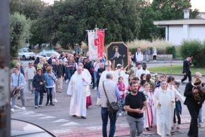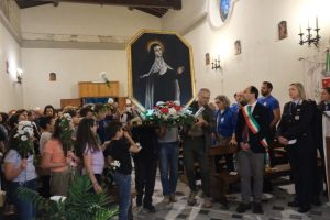 Grande festa ieri sera, 25 maggio, dunque, nella frazione di Bagnolo per le celebrazioni della santa Maria Maddalena de Pazzi. La santa mistica e scrittrice spirituale fiorentina, considerata la “santa di Montemurlo”, era solita trascorrere le estati nella villa Il Parugiano, dove ebbe le prime estasi e, non a caso la parrocchia della frazione porta il suo nome. Una festa che si è arricchita di un momento particolarmente solenne a livello religioso con l’arrivo al chiesino di una reliquia della santa Maria Maddalena, le cui spoglie riposano nell’omonimo monastero a Careggi a Firenze. Su concessione del cardinale di Firenze, Giuseppe Betori, un frammento dei resti mortali della santa è stato prelevato e portato a Bagnolo, dove ora è conservato in un nuovo reliquiario, realizzato dalla parrocchia per l’occasione. La chiesa di Bagnolo possedeva infatti un’altra reliquia, non del corpo della santa ma per contatto, cioè un lembo della veste appartenuta a Maria Maddalena. Le celebrazioni religiose hanno preso il via proprio da quella che fu la dimora della santa, dal chiesino di San Girolamo nella Villa del Parugiano. Qui, nel giardino della villa, la sera del 30 novembre 1578, all’imbrunire, mentre era in compagnia della madre Maria Buondelmonti, Maria Maddalena ebbe la sua prima estasi. La processione, alla quale ha preso parte in forma ufficiale anche il Comune di Montemurlo con il gonfalone, rappresentato dal sindaco Simone Calamai, dall’assessore Alberto Vignoli, dalla comandante della polizia municipale, Enrica Cappelli; presente anche il maresciallo Alessandro Cecchetti della locale Tenenza dei carabinieri.