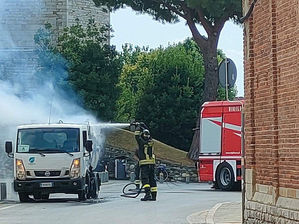 Un camioncino per la raccolta dei rifiuti è andato a fuoco oggi, verso le 12,30 all’altezza di piazza delle Carceri.