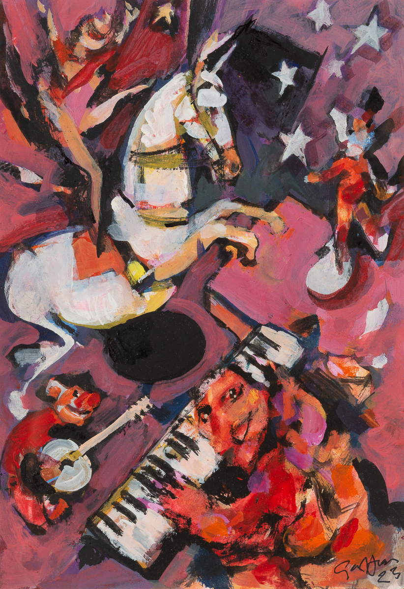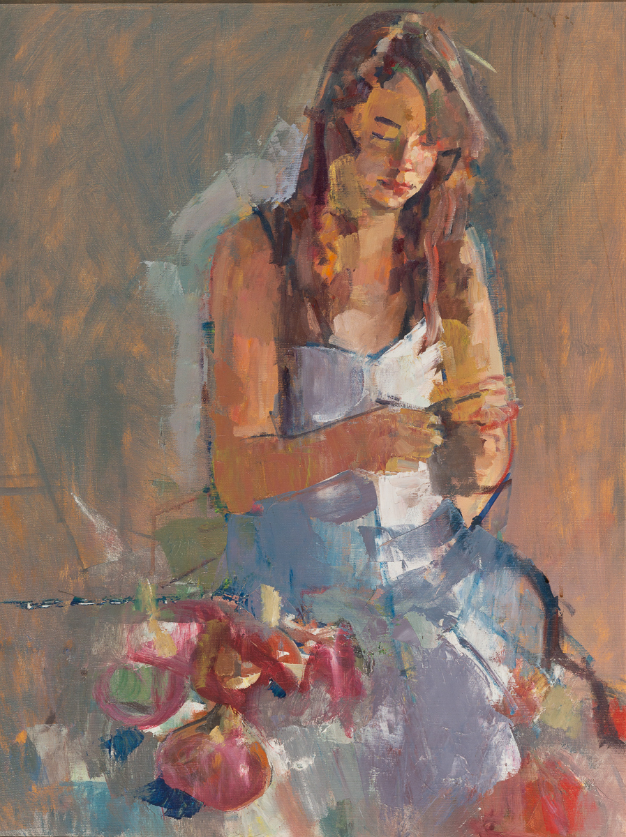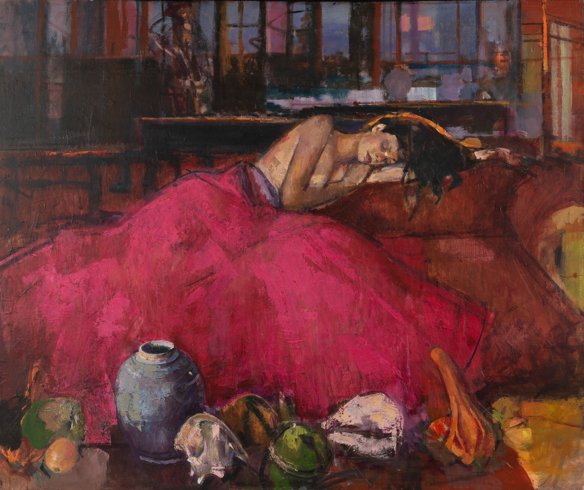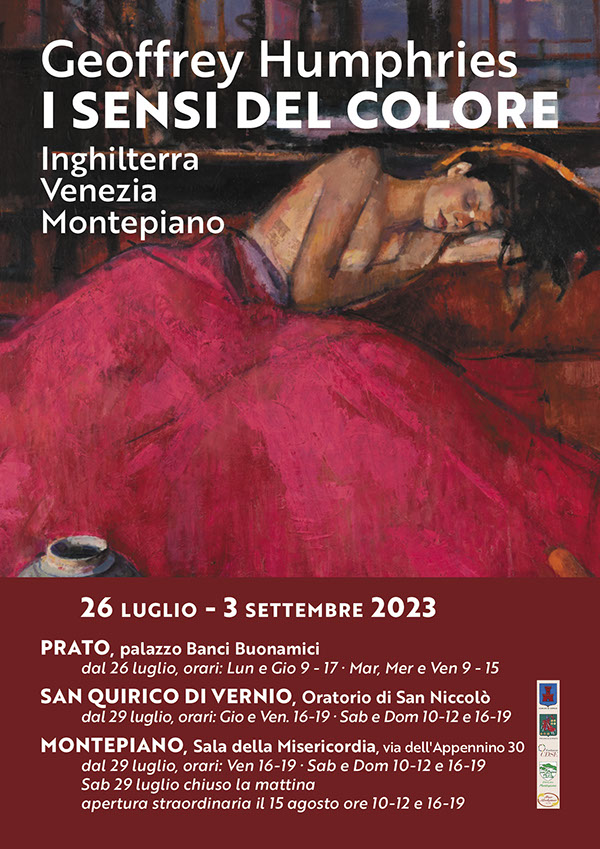 È il colore la cifra di lettura del lavoro di Humphries. Protagonista indiscusso dell’esposizione è il dialogo con il corpo umano. Il colore sprigiona la sua sensualità nei nudi femminili riflessi sulla Giudecca, nei languidi riposi delle modelle tra lanterne e paraventi, nelle vesti accese di infiniti blu e infiniti rossi. Ma quella di Humpries è una poetica poliedrica, che si offre ai nostri occhi come un parasole sfaccettato in perpetuo movimento, che gira e stordisce. Visionarie apparizioni di femminili tentazioni, l’immaginario senza tempo del circo e del café chantant, luminosi brani di paesaggio toscano, con la tavolozza virata sui verdi e gli ocra di un’ideale palette montepianina e l’inconfondibile serenità dello skyline della Badia.