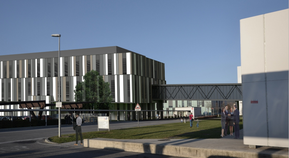 Il rendering della nuova palazzina che sarà collegata all’attuale nosocomio da un tunnel