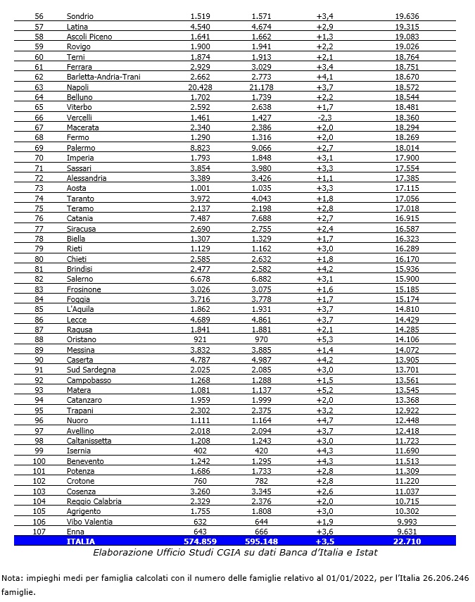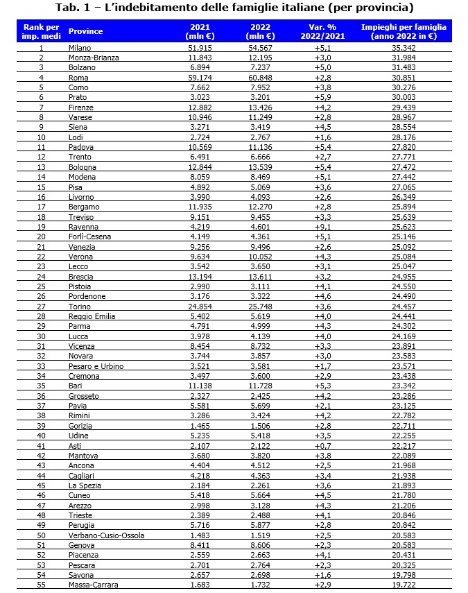 “Sebbene lo stock dei debiti sia in aumento a causa dell’inflazione, dell’incremento del costo dei mutui e dell’impennata delle bollette che hanno segnato negativamente gran parte dell’anno scorso, la situazione è critica, ma ancora sotto controllo” spiega la CGIS. “E’ probabile che l’incremento dei debiti sia in parte riconducibile alla forte ripresa economica avvenuta nel biennio 2021-2022. Le aree provinciali più esposte economicamente, infatti, sono anche quelle che presentano i livelli di reddito più elevati”.
