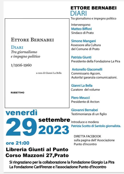 Il volume "Ettore Bernabei. Diari 1956-1960 Tra giornalismo e impegno politico" a cura di Gianni La Bella sarà presentato venerdì sera presso la libreria Giunti al Punto