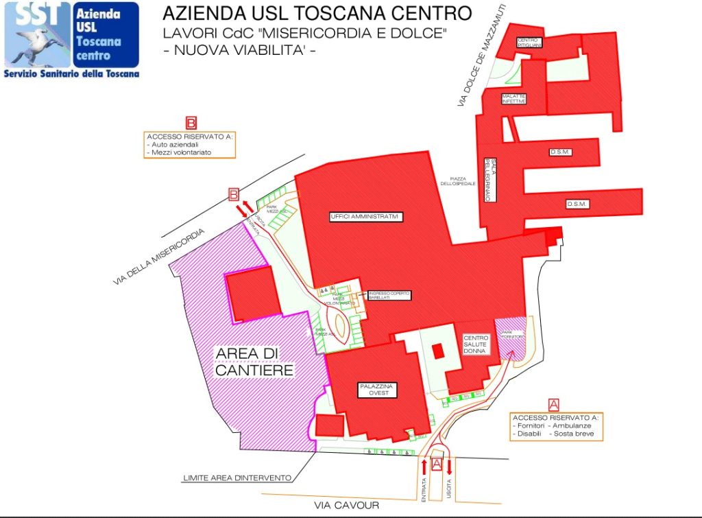 Gli ingressi carrabili saranno da via Cavour 87 (ingresso A) e dal via della Misericordia (ingresso B). I suddetti varchi dovranno essere utilizzati anche per le manovre di uscita dall’area. Saranno consentiti accessi ai soli mezzi autorizzati ovvero: persone disabili con contrassegno in corso di validità, sosta breve, fornitori, auto aziendali, mezzi di volontariato per trasporto utenti, autoambulanze, servizio pulizie, servizio di manutenzione, servizio facchini, servizio corrieri.