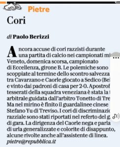 Su Repubblica di venerdì scorso, nella rubrica Pietre, diario quotidiano del razzismo in Italia curato da Paolo Berizzi, la notizia che alla fine di una partita del Cavarzano la squadra avversaria ha rivolto offese alla terna arbitrale, in particolare a uno dei guardalinee di origine cinese, Stefano Hu. Sul referto arbitrale sono finiti i cori di discriminazione razziale.