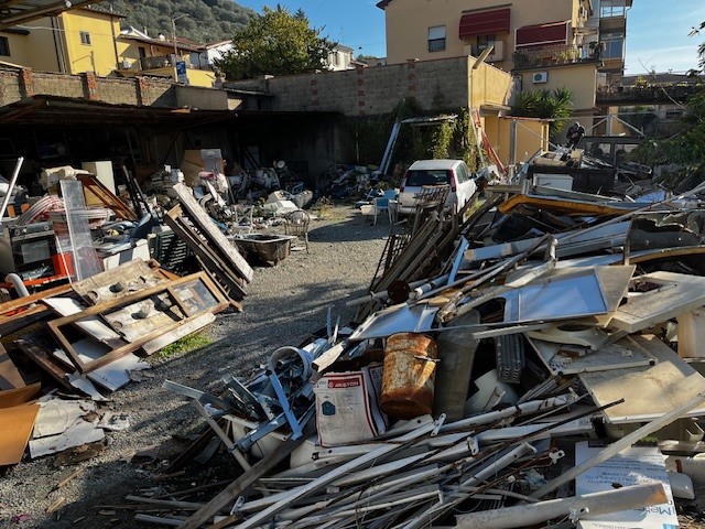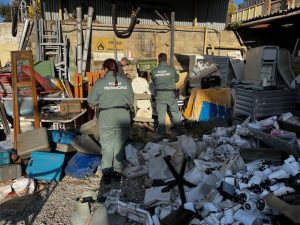 L’ispezione ha permesso di accertare la presenza di numerosi cumuli di rifiuti accatastati sul terreno: sia rifiuti non pericolosi, costituiti da materiali ferrosi di vario genere, imballaggi in legno, plastica, RAEE, sia rifiuti pericolosi, costituiti da frigoriferi, batterie, schermi di computer e televisori, parti di veicoli e ciclomotori oltre ad alcune bombole del gas.