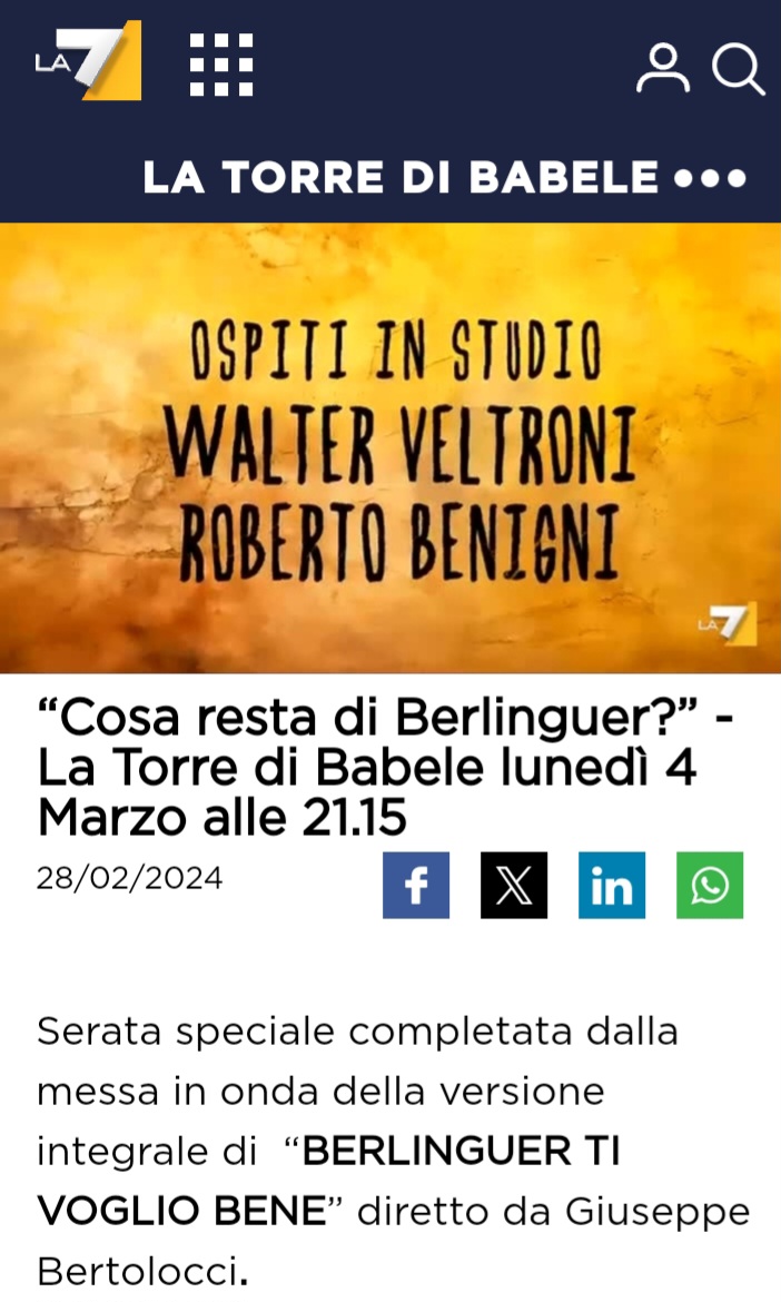 Per 47 anni nessuna televisione lo ha mai mandato in onda. A rompere il tabù attorno al film Berlinguer ti voglio bene, opera prima come attore, soggettista e sceneggiatore di Roberto Benigni al fianco del regista Giuseppe Bertolucci sarà La7 che lunedì 4 marzo lo trasmetterà in coda al programma La Torre di Babele, condotto da Corrado Augias e dedicato a cosa resta oggi di Enrico Berlinguer. Il film sarà preceduto da una conversazione di Augias con Roberto Benigni e Walter Veltroni. Si parlerà fra l’altro del ruolo che il leader del Pci ricoprì negli anni Settanta feriti dal terrorismo e sulla figura quasi messianica che rivestì per le folle che aspettavano un suo cenno, per mobilitarsi.
