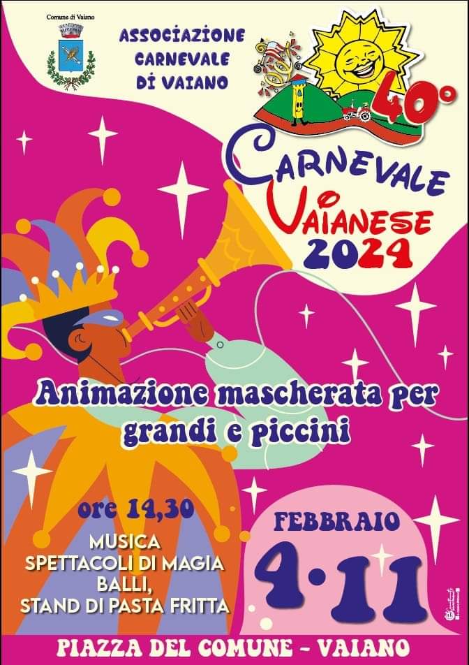 Domenica 11 febbraio torna per la seconda giornata il Carnevale vaianese, giunto alla quarantaduesima edizione. Grande festa mascherata in piazza del Comune dalle 14.30. La manifestazione, promossa dall’Associazione Carnevale con l’amministrazione comunale, offre una kermesse con animazione di tutti i gusti: musica, spettacoli di magia e balli. Non mancano i gonfiabili per il divertimento dei più piccoli. Ad accogliere i partecipanti alcuni personaggi-simbolo dei carri del Carnevale, realizzati nel corso degli anni con grande abilità creativa dai volontari dell’Associazione Carnevale. Per far sognare grandi e piccini ci sarà il protagonista di Dragon Ball, l’enorme balena e Pinocchio. Per i golosi è attivo lo stand di pasta fritta, attivo per tutta la durata dell’evento.