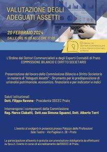 Martedì 20 febbraio alle 15 al Palazzo delle Professioni (via Pugliesi 26) l’Ordine pratese presenta il lavoro della Commissione Bilancio e Diritto Societario in materia di “Adeguati assetti”. Come si è accennato uno strumento per la predisposizione di un’analisi patrimoniale, economica, finanziaria e per indicatori e indici. Il presidente dell’ODCEC Filippo Ravone apre il pomeriggio per dare poi la parola ai componenti della Commissione: Marco Ciabatti, Simona Sguanci, Alberto Torri e Benedetta Calamai.