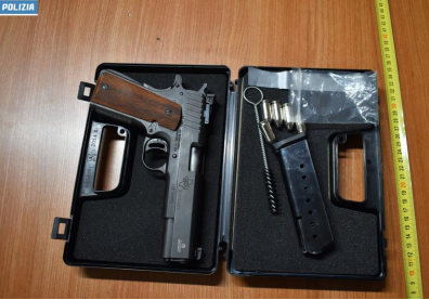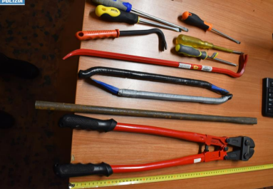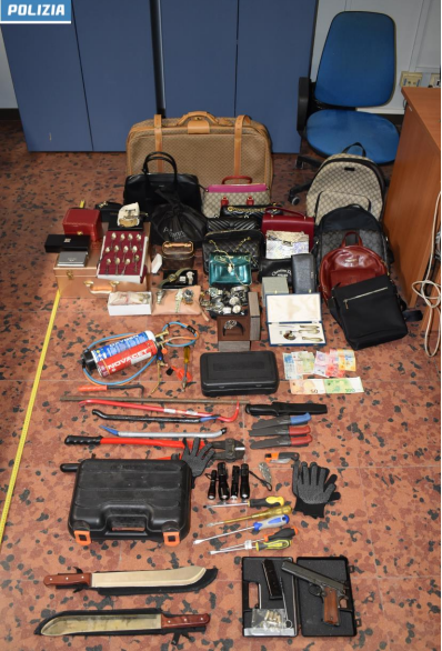 Una pistola per uso sportivo, provvista di munizioni, rubata in Lombardia un anno fa. Numerosi coltelli, machete, pugnali, e oggetti da scasso fra cui una fiamma ossidrica, una smerigliatrice, torce.