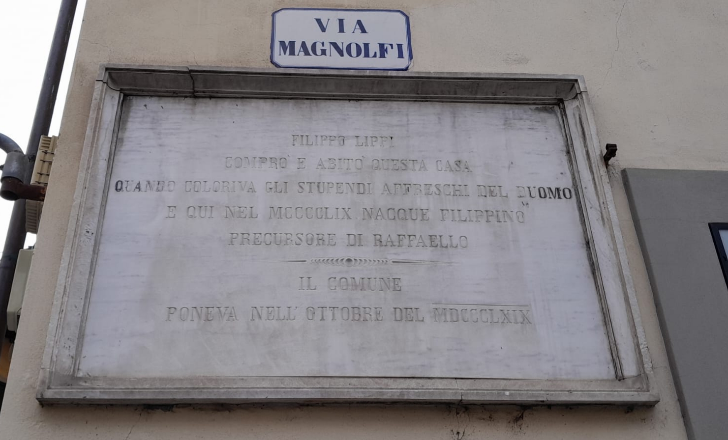 … posta all’angolo con la via intitolata al pittore, troppo in alto per caratteri divenuti col tempo quasi illeggibili. Vi è scritto che nel 1459 lì, nella casa comprata dal padre Fra Filippo, nacque Filippino. Aggiungendo una prerogativa “precursore di Raffaello” praticamente ignota in città.